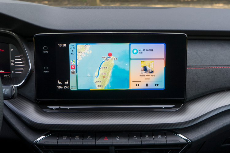 這第3.5代CNS資訊娛樂系統當然也支援Apple Carplay(無線)與Android Auto(有線),且在使用導航app時也可將導航(左右轉彎)提示顯示於HUD抬頭投影顯示幕上。系統也有內建導航系統,不過實際使用之下發現它似乎在定位上有些延遲,總是在車子快要通過轉彎點時代表車輛的指標才突然「衝」到轉彎點叫你轉彎讓人有點措手不及。