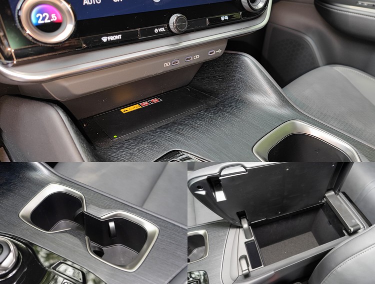 ▲上:手機無線充電板上方有三個USB-C插孔。左下:口徑大也有彈性固定設計的雙置杯座。右下:形狀方正的前座中央置物盒。