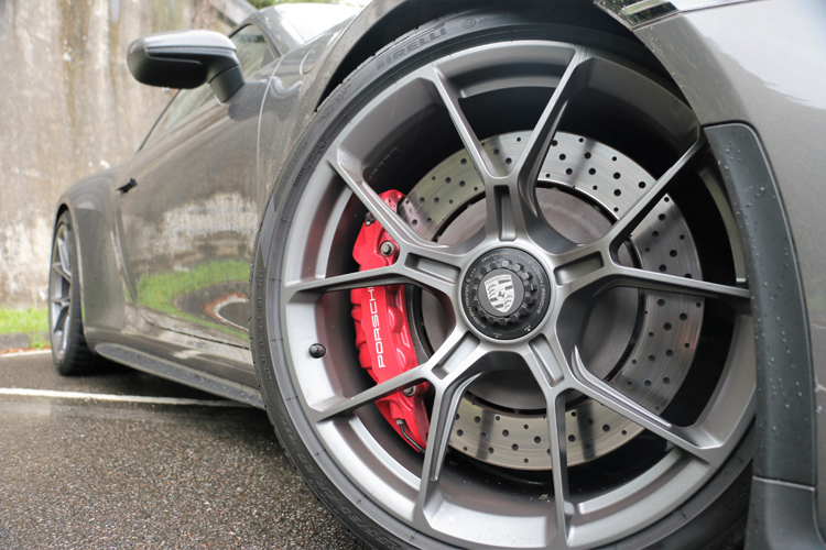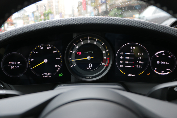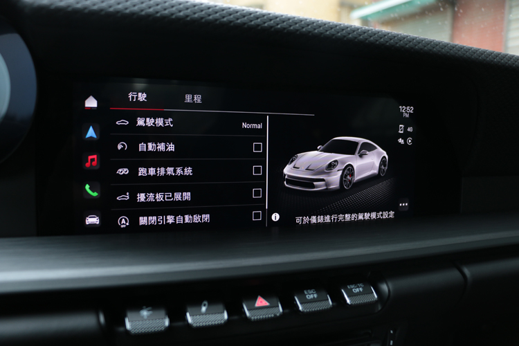 行車模式有Normal、Sport以及Track,透過方向盤上的旋鈕切換,後兩者模式可藉由中央螢幕或者儀表板來控制PASM電子懸吊、ESC/TC、排氣聲浪與退檔補油等細節。整天的試駕中,我們嘗試切換不同模式體驗車輛改變,911 GT3是一輛能溫和也能野性的一輛經典跑車,山路上想要徹底解放它的性能存在一定風險,不過是一輛好掌控的RR配置跑車,路感回饋扎實、動力輸出飽滿、雖然車身尺寸比起過往911 GT3還大,也不失該有的靈活度。標準配備PASM、PTV、後輪轉向系統以及機械式LSD,能輔佐駕駛用最快速度通過彎道。當然,你也可以關閉車輛所有輔助系統來釋放它的野性,此時你必須思考,有沒有能力可以駕馭它。