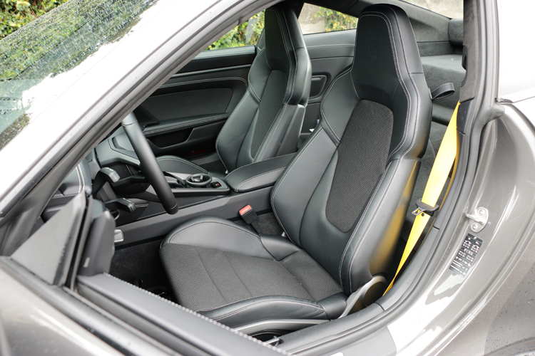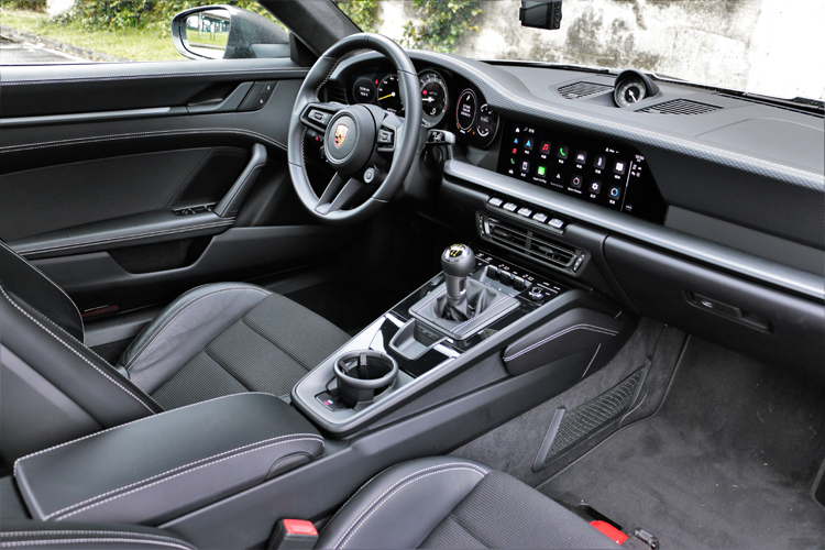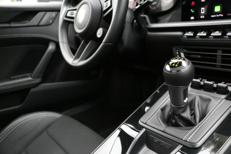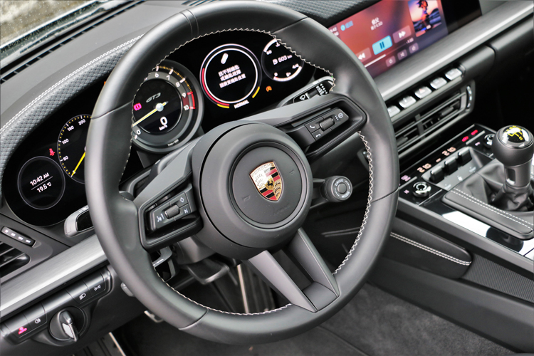 進到車內,最令我愛不釋手就是行程極短的手排排檔桿和三個踏板,在講求效率的時代中,傳統手排已慢慢被市場淘汰。大量使用液晶螢幕的年代中,Porsche盡可能堅持傳統,數位儀錶板中間還是保留傳統指針轉速表,左右兩邊的顯示則利用介面來營造出經典五環設計。除此之外,Porsche從利曼維持下來的左邊鑰匙,在Keyless時代的引擎啟動按鈕還是布局在駕駛左側。試駕車沒有選配賽車桶型座椅,雙前座四向電動調整跑車化座椅保留該有便利與舒適。