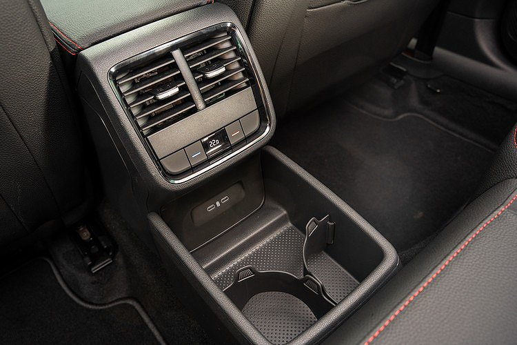 ▲後座中央有獨立空調溫度調整、2個USB-C插孔與彈性運用的置物收納盒