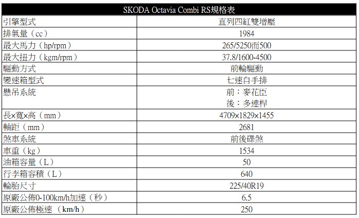 動力上,新Octavia Combi RS針對所搭載的「EA888 EVO4」2.0升直列四缸渦輪增壓汽油引擎進行運轉動態特性及輸出調校,讓最大馬力輸出從原本的245hp小幅增加至265hp,最大馬力輸出的轉速帶則維持在5000-6000rpm,最大扭力37.8kgm/1600-4300rpm也沒變,當然,所搭配的變速箱也還是DSG七速雙離合器自手排變速系統。