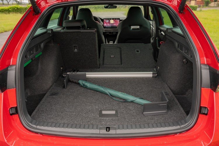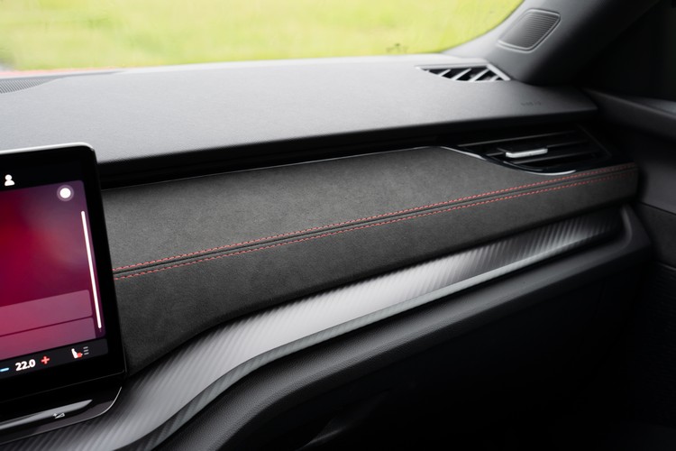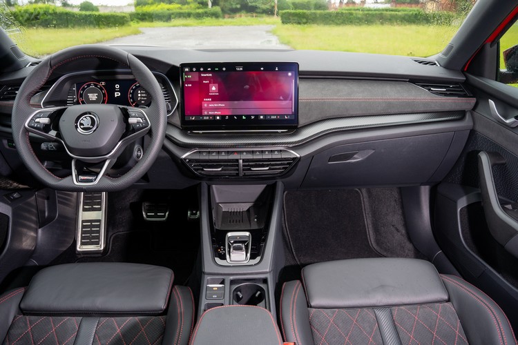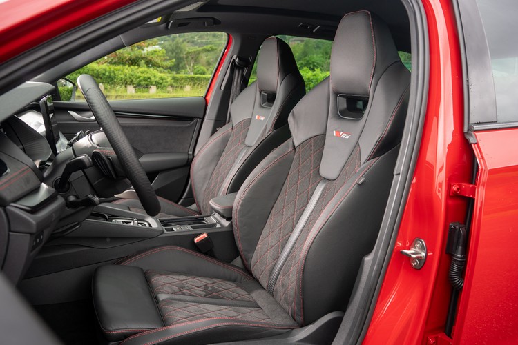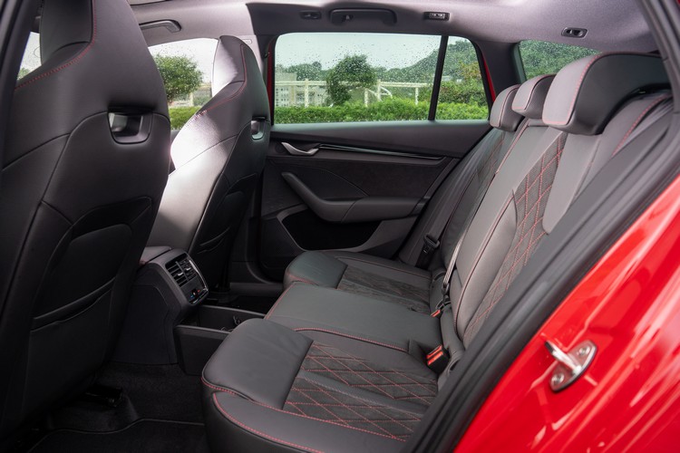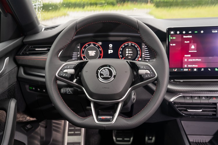 呼應外觀, Octavia Combi RS車室內以黑色為主調,搭配紅色縫線等細節來營造運動化的氣氛。控台下層採用專屬的碳纖維飾板。而像換檔介面飾板等細節則採用霧鉻銀處理。三輻跑車式平底真皮多功能方向盤除了下緣RS logo有微小的改變外整體式樣沒變。方向盤前方的數位儀錶除了經典、擴展與精簡三個畫面風格模式外同樣多出RS專屬的Sport畫面風格模式,且跟小改前的畫面不一樣,不過兩者間沒有什麼絕對的好壞之分,端視個人主觀的感覺。