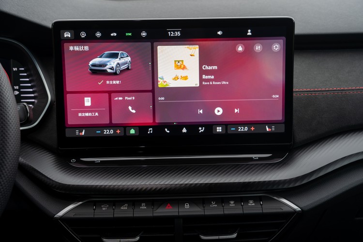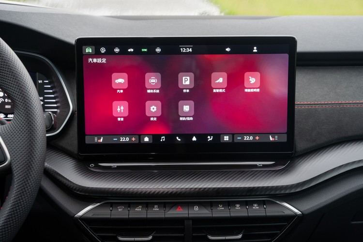 中控螢幕下方的實體按鈕之前在Enyaq上也有見到,其中的駕駛模式按鈕是循環切換機制,如果開車途中只想在兩個模式之間轉換會有點不便。不過整體來說車內功能調整介面算是好用。而對於Apple Carplay與Android Auto提供有線/無線連結操作支援當然也是有給個讚的地方。