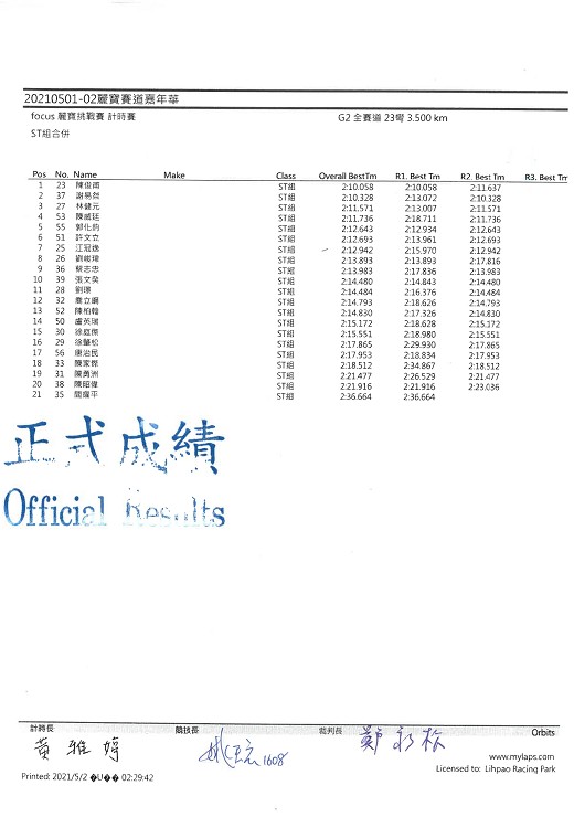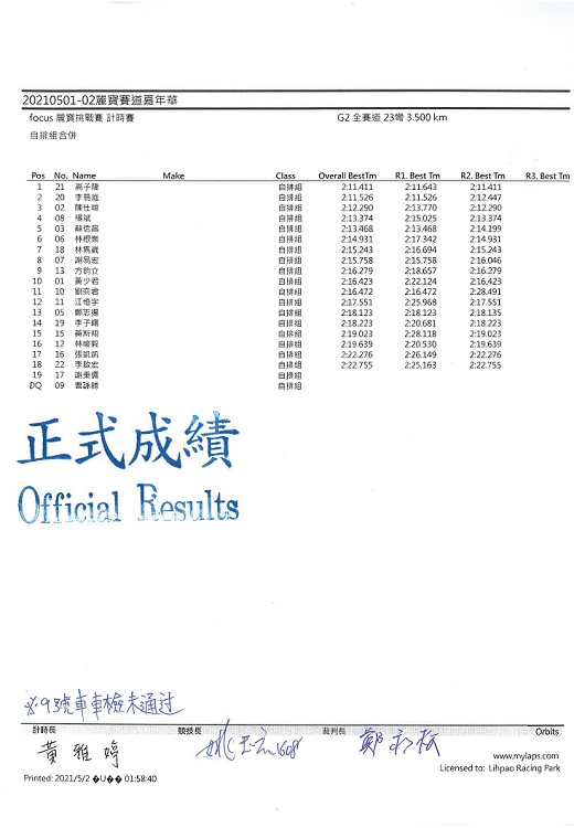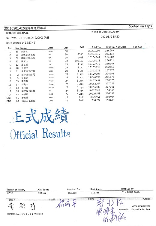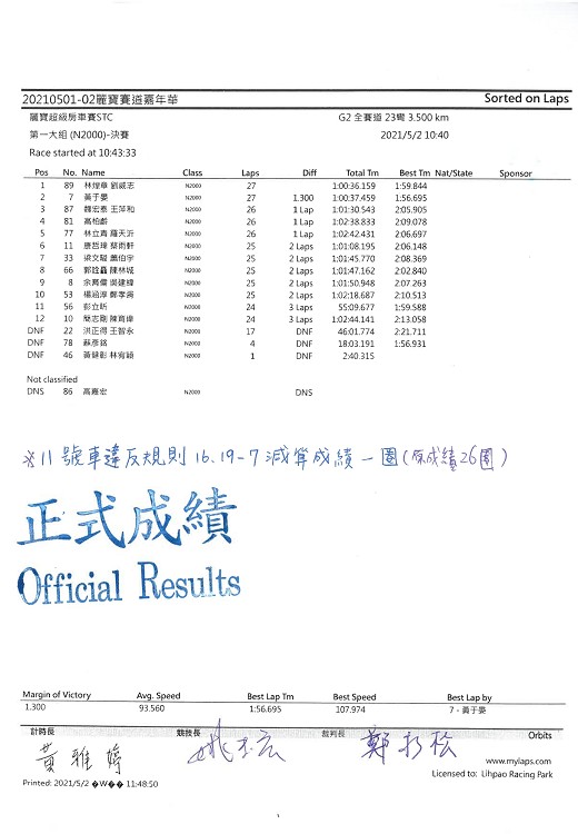 首先競爭最激烈的為N2000組別,因為所有車輛都為相同等級,但由於參賽車輛的改裝幅度還是有差異,所以一開賽就很明顯的看出勝負,前一天做出桿位的7號車黃于晏,起跑後與78號車蘇彥銘進行了幾圈的纏鬥,後來78號車機械故障而退賽,之後就由7號車獨走大半場比賽。到了比賽尾聲,7號車發現賽道上有油漬便放慢車速,加上誤判對手名次的情況下,89號車林煌章、劉威志悄悄超越7號車,當7號車反應過來時,為時已晚,將原本穩拿的冠軍獎盃拱手讓人。 ![]() ▲N2000組,冠軍林煌章、劉威志,亞軍黃于晏,季軍魏宏泰、王萍和。![]() ▲Turbo組別,冠軍王建民,亞軍苗華斌、翁志元 ,季軍吳益洲。![]() ▲TCR組別,冠軍黃錦章、黃淑妮。![]() ▲S2000組別,冠軍朱嘉偉。