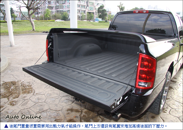 前保險桿經過風洞測試設計維持高速行駛穩定性外,後貨斗尾門上還加裝尾翼,DODGE Ram SRT-10有分兩門版本跟四門版本,兩者最大差異除了車門數不同外,在兩門版本上後面貨斗會加上蓋子,除了讓私人物品有隱私又可以避免高速下不會因為貨斗產生亂流影響高速穩定。腳下輪胎尺寸為305/40R22倍耐力性能胎,扭力太大造成後輪時常空轉,試駕過程中發現輪胎幾乎是磨平狀態,讓我們試駕過程特別小心。