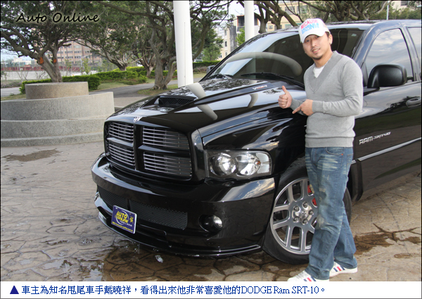 車主戴曉祥是一位甩尾車手,當初會購買DODGE Ram SRT-10是因為看上它性能強悍外加有貨卡該有的方便性,後面拖一台拖車放上甩尾比賽車輛,後斗則可以載甩尾備用輪胎,四門設計又不失載人的方便性,多項好處讓他選擇購買DODGE Ram SRT-10。還特地遠赴美國尋找車輛,看了很多台才選擇這台里程數少,內裝完整、乾淨、引擎狀況良好的四門版DODGE Ram SRT10。