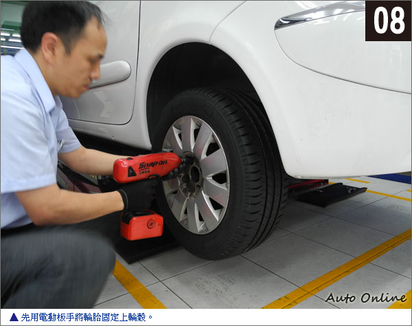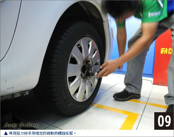 作好輪胎的動態平衡後,即可把輪胎裝上車,較細心的店家,通常都會先用氣動(電動)板手將輪胎用螺絲先固定住,再使用扭力板手採原廠設定的力量把螺絲栓緊,不過還是有很多店家直接用氣動(電動)板手拴緊,草草了事。這可是關係著輪胎螺絲會不會鎖太緊到斷裂,而影響行車安全的關鍵,千萬不可忽視。