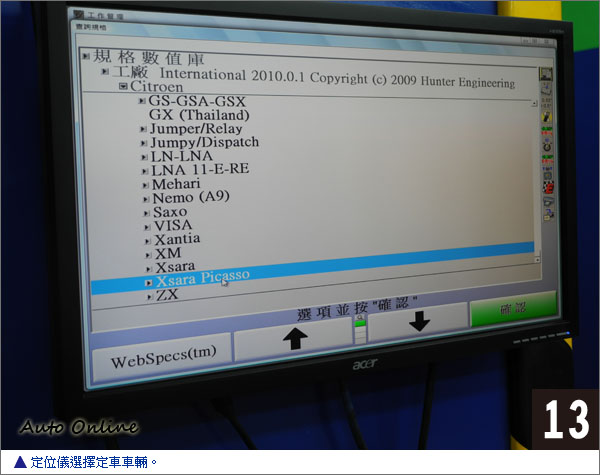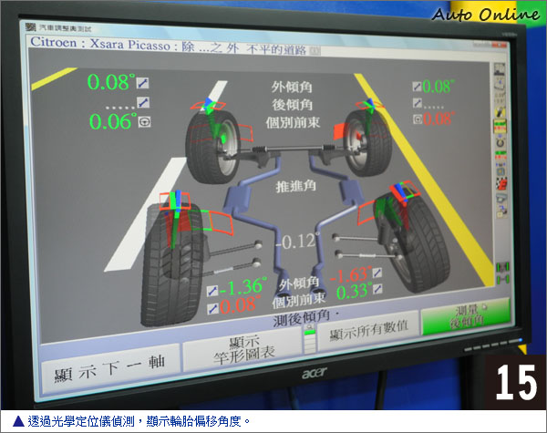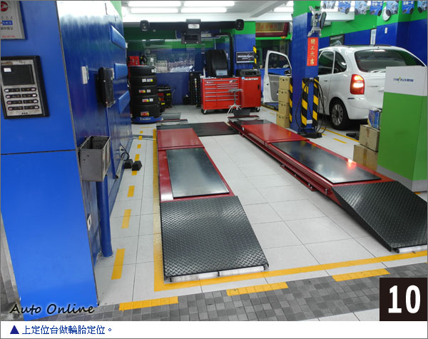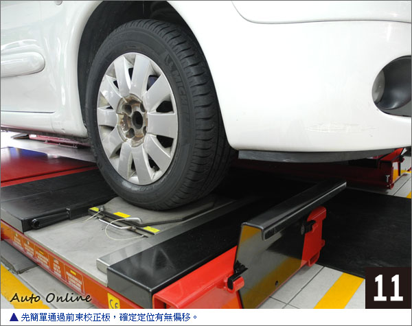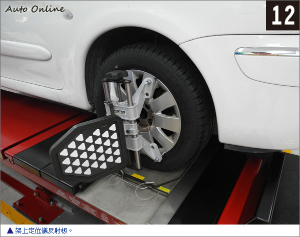 若你是一次將四只輪胎全數替換掉,通常換胎店家還會附贈一次四輪定位。雖然你可以看到店家將輪胎開上定位台,不過有些只會用定位台上的前束校正板,概略的看看你車輛是否有Toe in或Toe out的現象。也店家會開啟定位電腦,透過雷射掃描精準判斷Toe in或Toe out的偏移角度,再來調整懸吊拉桿,調整回輪胎無偏移的角度。