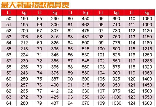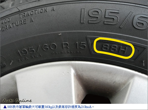 以前夾雜在輪胎尺碼標示裡的最高容許速度,現已經獨立出來與負載指數並在一起,以圖示的88H為例,88表示單輪最大的載重指數,代表著一個輪胎可以承受最多至560kg的重量;H則是輪胎的最高容許速度,代表這輪胎被允許在210km/h以內的時速下工作。有些輪胎他的單輪最大載重公斤數,被直接標示在胎壁上,與最大充氣磅數圈在一起,不必透過換算即一目了然。