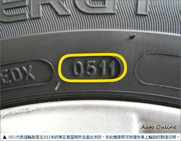 有些消費者會在意輪胎生產地的問題,這生產地則清楚的直接標示在輪胎之上,無須換算解碼,仔細找找就可以看到了。另外,許多消費者會注重輪胎的製造日期,你可在胎壁上找到一組四位的數字,以圖示的0511為例,這輪胎是在2011年的第五個星期所生產出來的,依此類推不難看車你車上輪胎的製造日期。
