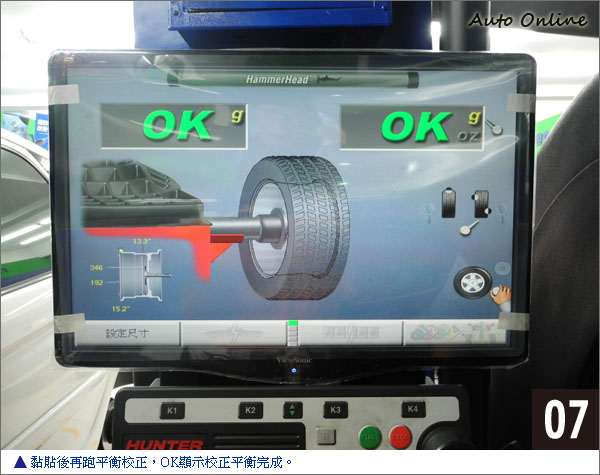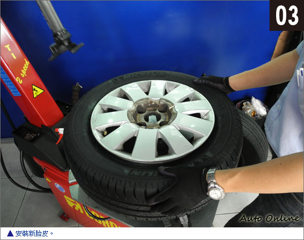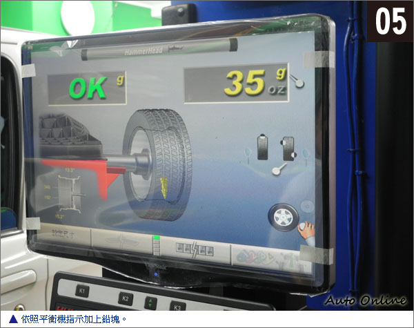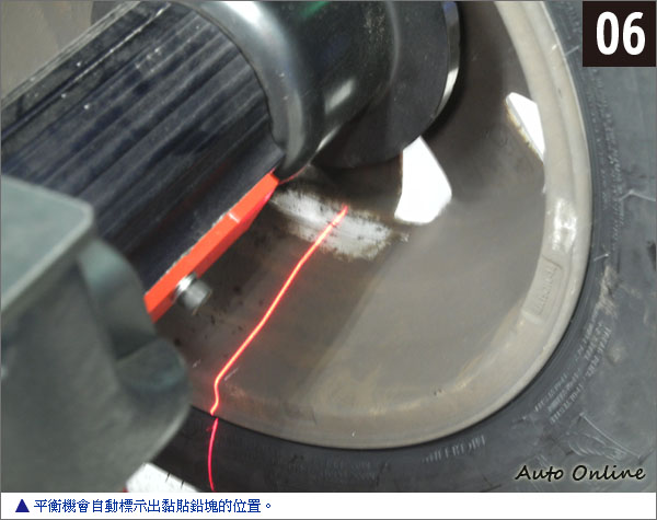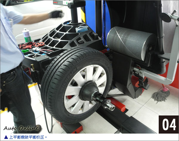 第二動裝上新胎皮後,幫胎圈組做動態的平衡校正。透過平衡機可將輪圈配重的點及配上多少重量的鉛塊,清楚的標示出來,平衡校正過後,車輛高速行駛時便不容易因輪胎滾動時的不平衡,導致不舒適的跳動感受。