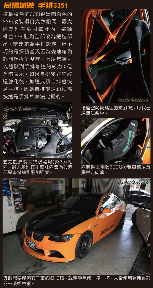 ![]() ▲為了要讓車輛能發揮最好的狀態,黑陶添購300萬元的Dynapack 3000馬力機,出自於國信汽車之手的作品都能有最好的品質。BMW總代理汎德並未販售335i手排車款,只有少數的水貨商引進,引擎動力提升之後最怕的就是變速箱無法承受。黑陶這輛白色335i搭載的六速手自排變速箱,最大只能承受400hp馬力以及50kgm扭力的輸出,動力提升超過600匹之後,在渦輪開啟時還撐得住,當NOS一介入之後,變速箱無法承受突如其來的強勁動力而打滑,間接影響加速成績。黑陶表示,這顆ZF變速箱有推出強化套件,但目前台灣沒有技術施工,所以要將整顆變速箱寄到國外強化再寄回台灣,這也是黑陶下一步提升的計畫。 ![]() ▲加速感覺從靜止到300km/h都不曾停歇,只要稍微不注意就有可能直接插錶,如果再開啟NOS相信動力的輸出會讓人直冒冷汗。