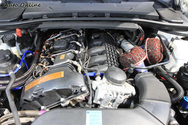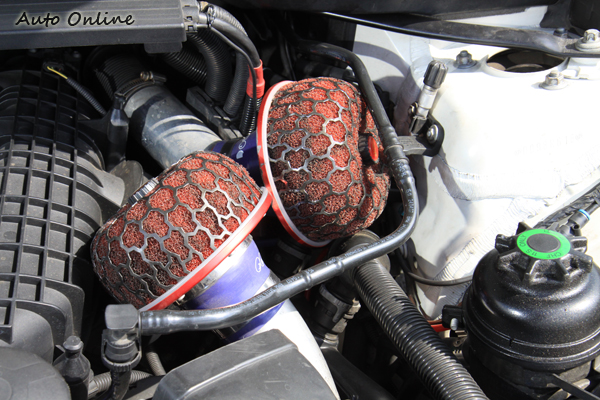 ![]() ▲外觀走低調風格沒有大幅度的改變,只有換上M3樣式的前保險桿。這輛白色的BMW 335i E90是龍潭國信汽車店東的座駕,國信汽車以改裝動力為主,起初以日系車大宗慢慢店東黑陶迷上歐系車的扎實底盤設定,開啟改裝歐系車之路。要改裝當然要先摸清楚對方底子,投資一輛鎮店之寶也是店家打廣告最好的方法,有著BMW經典的六缸雙渦輪增壓引擎E92 335i是黑陶心目中最佳選擇。 ![]() ▲N54B30為雙渦輪配置,進氣香菇頭當然要乘二,進氣的提升也是改裝動力的第一步。