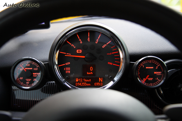 ![]() ▲車側這張英國國旗的大型彩繪貼紙,有點違背不想被關注的想法。這輛Mini Clubman Hampton Cooper S主要針對性能、底盤做最主要的強化方向,外觀上大致維持Mini Clubman Hampton的原樣,後照鏡外蓋的Damson Red水波紋、位於B注的Hampton徽飾、車側方向燈飾板上的Hampton徽飾設計及水箱護罩上鑲嵌的50週年紀念LOGO都維持原樣,車主只在車側做了英國國旗的彩繪貼紙,增添Mini的殺氣與愛車的獨特性。 ![]() ▲2012發表的BBS LM兩片式鍛造鋁圈,黑色與亮銀的顏色搭配;裡面藏著AP Pro 5000+煞車組。![]() ▲內裝維持原廠式樣並沒有加裝太多的改裝品。![]() ▲引擎監控部分只加裝Pivot的水溫表跟渦輪增壓表,隨時監控引擎狀況有問題可以提早發現。