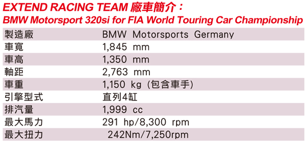 ![]() ▲BMW Motorsport 320si目前計畫在明年參加澳門房車大賽,並希望藉此讓台灣的賽車運動能在國外聞名。自從台灣屏東大鵬灣賽車場成立之後,總算有一座有點規模的賽車場地出現在台灣,讓一些沉寂已久的車輛改裝店或者改裝部品製造廠商萌起了賽車的念頭。 ![]() ▲專業生廠製造避震器的延宗企業,特地斥資向德國BMW MotorSport賽車部門,購入兩輛WTCC賽事等級的BMW Motorsport 320si。