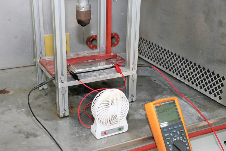 ▲測試過程中發動的電芯受到外力穿刺或者浸泡水中,電力依舊不減並持續運作。