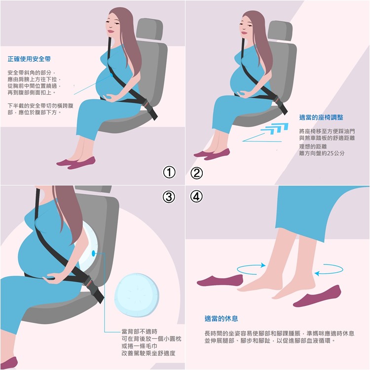 除了藉由車輛的安全性提供安心旅程,懷孕期間駕駛或乘車時,只要牢記圖中所示四大重點,準媽媽們也能在安全並舒適地享受行車過程。