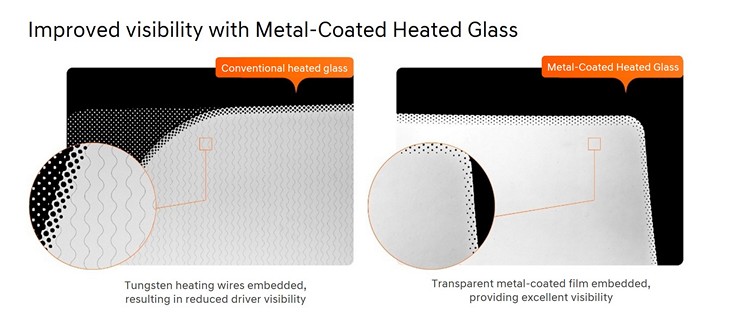 Genesis在德國發表了全球首創的48V金屬鍍膜加熱玻璃技術,並已在全球主要市場申請專利。這套技術的優勢在於除霜速度比起傳統技術快三倍,原廠實測在-18度C的氣溫下依然能夠快速除霜,不用5分鐘就能將前擋玻璃100%的結霜面完全清除。