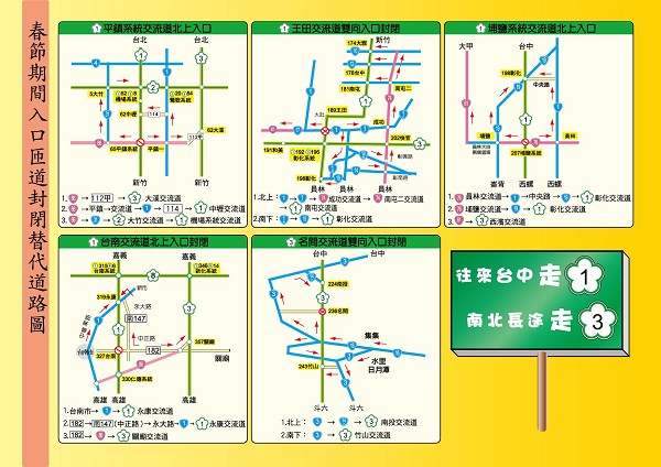 入口匝道封閉:2月5日(初三)至2月6日(初四)共2日,全日封閉北上入口匝道:國道1號台南、埔鹽系統、平鎮系統等交流道。雙向入口匝道:國道1號王田交流道及國道3號名間交流道。