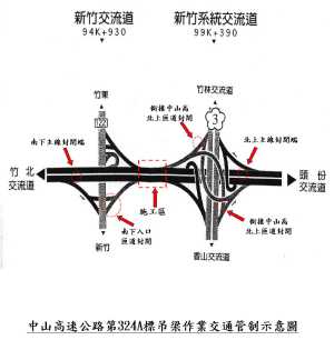 為辦理中山高速公路楊梅新竹段拓寬第324A標 (配合中山高速公路新竹交流道改善工程增設園區交流道) 工程之迴車道跨越橋鋼樑吊裝、雙園路跨越橋拆除及園區二路跨越橋預力樑吊裝等施工作業,封閉中山高速公路主線、匝道及雙園路(竹12線)部份路段,相關配合注意事項如下: