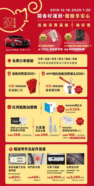 NISSAN 2020「開春好運到,健檢享安心」春節健檢活動期間,車主凡回廠消費滿300元,即可獲贈NISSAN紅包袋乙份,消費滿1,000元則可參加「千元保修抵用券」抽獎活動,若使用APP預約回廠消費滿3,000元再加贈NISSAN鼠來寳吊飾乙個,並可參加「飛利浦義式咖啡機」(型號EP2220,定價36,900元)抽獎活動,此外,玉山NISSAN感心聯名卡卡友於活動期間刷卡滿額贈電子抵用券,讓車主同時享受NISSAN優質原廠服務及新春福氣好禮。