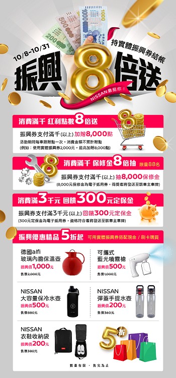 裕隆日產汽車為響應經濟部振興經濟方案,自10月8日起至10月31日止,同步推出「NISSAN振興8倍送」車主返廠優惠活動,車主凡於期間內返廠持實體振興券消費滿千(以上),可獲得8倍紅利點數,最高8,000點數回饋,車主同時可參加限量88名8,000元保修金抽獎活動。另外,以實體振興券結帳金額滿3,000元(以上),還可再獲得滿額回饋最高300元的10%定保金,且於下次回廠定保時即可直接使用定保金折抵300元,若再搭配輪胎加價購使用8,800點可再折抵300元,共計可省600元。
