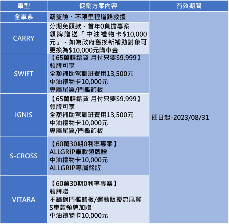 ![]() 為了持續造福新手駕駛,TAIWAN SUZUKI本月購車優惠再加碼:出示駕照或正在駕訓班上課之相關證明,購買SWIFT/IGNIS車款即可享有駕訓班費用13,500元全額補助!此外還可享舊換新優惠價及65萬輕鬆貸購車專案,月付只要9,999就能將愛車輕鬆開回家,領牌再送10,000元加油金!好禮優惠享不停,就是要讓您輕鬆入主無負擔。