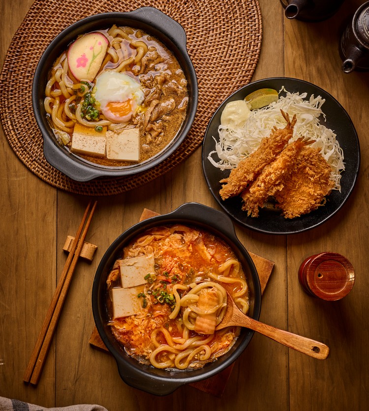 另一款烏龍麵則是嚴選日本經典風味壽喜燒鍋來做為基底的「海老腰內壽喜牛烏龍鍋」。新鮮牛肉添加日式醬油味醂與砂糖,搭配讚岐烏龍麵、新鮮豆腐、特級溫泉蛋等一同燉煮,打造出甜鹹交織的雙重享受;其餐點也包含一片腰內豬排、兩尾海老及新鮮的高麗菜絲,絕對是肉控首選。