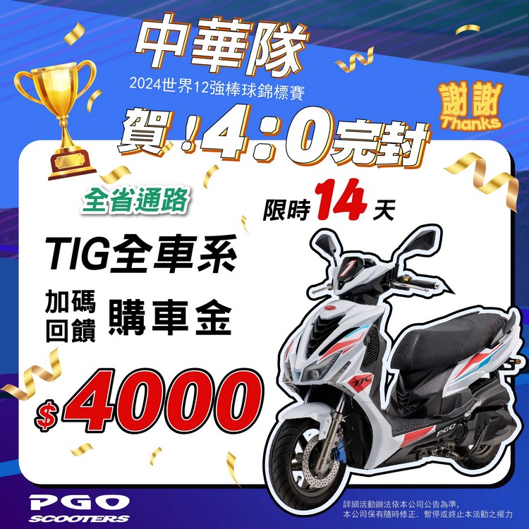 中華隊封王 PGO TIG 熱血加碼4000購車金!