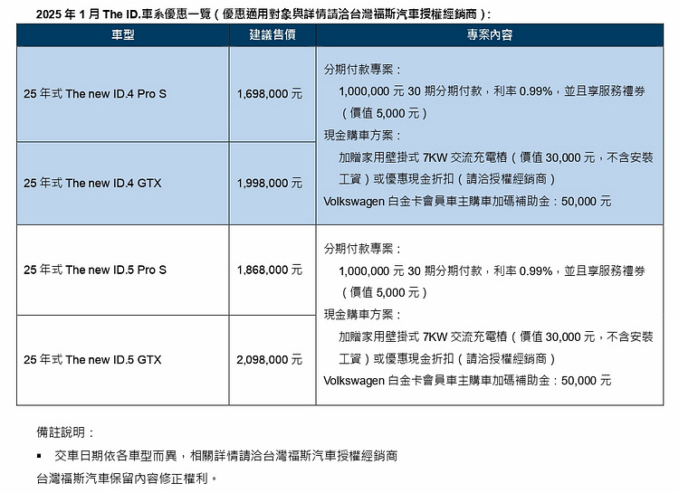 即日起至1月底, ID.車系推出多項限時購車優惠,現在入主不僅可享低利率100萬30期分期付款專案,還能獲得價值5,000元服務禮券,現金購車方案有機會獲得好禮家用壁掛式7KW交流充電樁(價值30,000元),Volkswagen白金卡會員車主換購車再享加碼補助金50,000元。