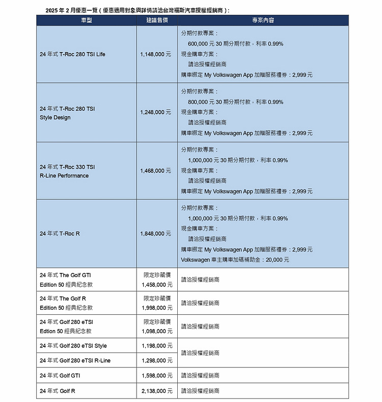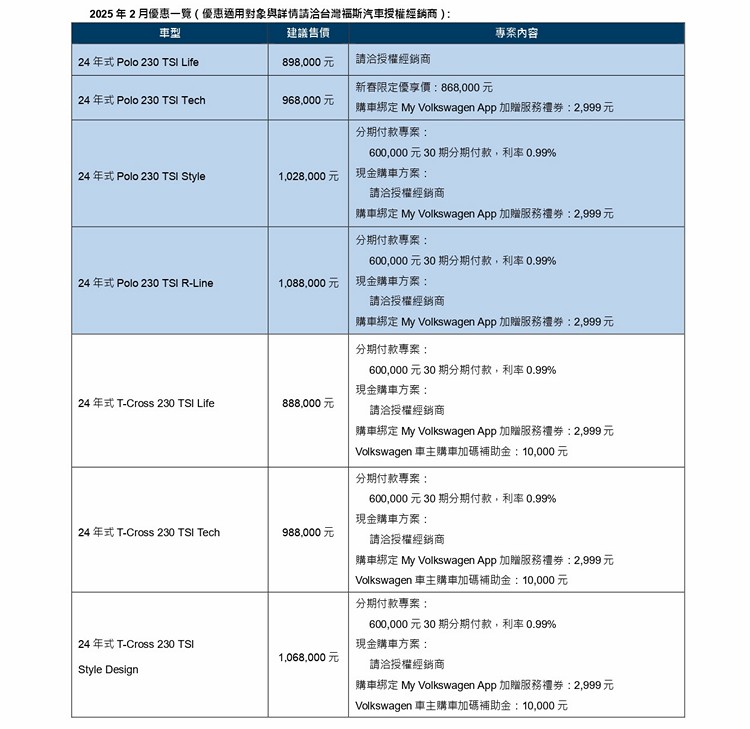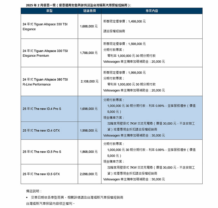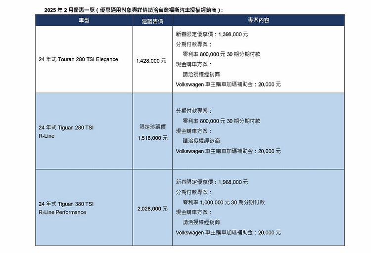 Volkswagen Tiguan Allspace推出期間限定優惠,即日起至2月底止領牌,330 TSI Elegance車型享新春限定優享價149.8萬元,指定車型另享零利率高額分期付款專案回饋及Volkswagen車主購車加碼補助金20,000元,最高優惠超過20萬元。