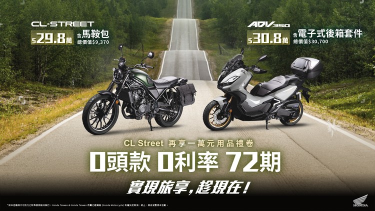 ![]() 另外,為了提升絕佳的騎乘體驗推出「實現旅享 趁現在」專案,冒險意象ADV350:30.8萬,兼顧都會通勤與休閒騎乘,加贈電子後箱(價值30,700),無論是在繁忙的都市街道,還是在蜿蜒的山路,都能展現獨特的魅力和全面的裝載性能。率性風格的CL STREET:29.8萬,以經典的 Scrambler 元素與現代科技相結合,加贈馬鞍包(價值9,370),成為展現自我、享受騎乘的理想夥伴,以上兩台車款,再享72期、零頭款、零利率。