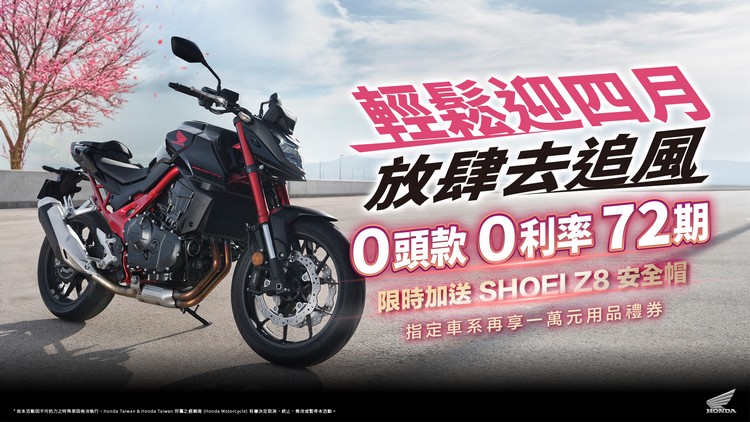 Honda Taiwan二輪部門推出「輕鬆迎四月 放肆去追風」專案,指定車款72期、零頭款、零利率限時加送Shoei Z-8安全帽,特定車款再送一萬元配件金。