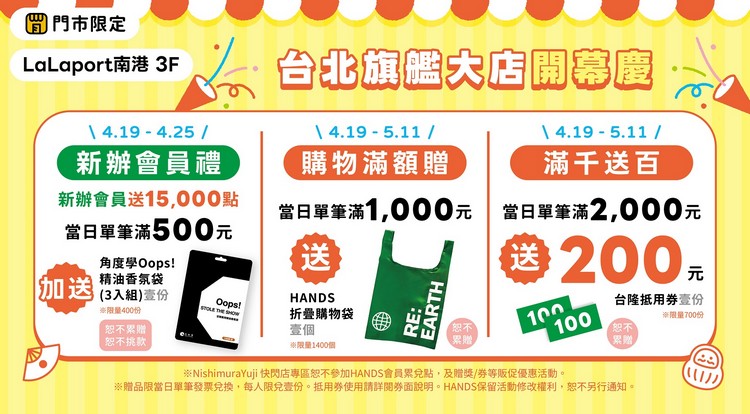 HANDS台隆手創館台北旗艦大店4月19日起,在LaLaport南港店三樓與大家見面,近400坪遊逛空間,35米全台最大寬敞門面。開幕亮點搶先看!全台獨家NishimuraYuji-西村優志-快閃店專區、五大生活專區-想變美/想睡好/想舒壓/想療癒/想旅遊,超過2萬品日系選物一站購足。台隆手創館南港店4月19日至5月11日舉辦〈開幕慶〉活動檔期,新辦會員獨家滿額贈「角度學Oops!精油香氛袋(3入組/市價590元)」;購物滿2千送2百元台隆抵用券,抵用券無使用門檻十足抵用回饋;單筆滿1千元贈送HANDS折疊購物袋,輕巧好收納,清水洗滌即可重複使用。