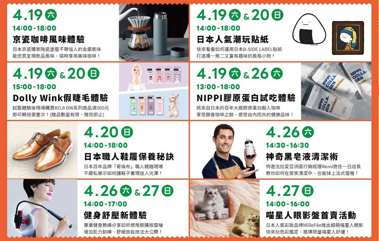 日本熱賣NIPPI膠原蛋白,搭配日常咖啡提供試喝體驗。台隆手創館明星商品ATEX Lourdes MINI口袋型筋膜按摩槍,多工設計的按摩人氣商品,增強肌力、舒緩放鬆必備。假睫毛總是戴不好嗎?讓Dolly Wink美妝達人親身示範,輕輕鬆鬆美麗變身。日妞最愛MilleFée彩妝新品-喵星人眼影盤新品體驗活動,由彩妝老師講解彩妝盤的上妝訣竅。