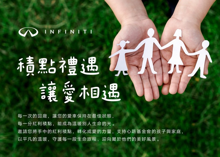 INFINITI持續將品牌核心價值深植於日常經營之中,以行動落實ESG永續精神,致力為社會創造正向影響,並誠摯邀請車主共同響應,將紅利點數兌換權益化作更具善念價值的公益助力,一同參與傳遞愛與關懷。