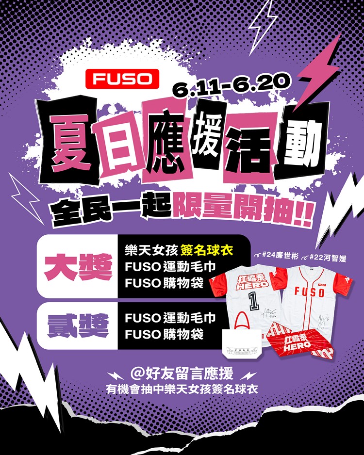 期間限定抽好禮![]() FUSO 即日起於FUSO官方 Facebook 粉絲專頁舉辦「FUSO 夏日應援」抽獎活動,凡追蹤、按讚 FUSO官方 Facebook 粉絲專頁並於活動貼文底下標記好友及輸入關鍵字「與 FUSO 一起夏日應援」,即有機會抽中【樂天女孩限量簽名 FUSO X Kappa棒球衣】及【FUSO 限量 HERO 扛霸包 】。本次簽名球衣由深受粉絲喜愛的五位樂天女孩——河智媛、廉世彬、禹洙漢、嘎琳、穎樂親筆簽名。