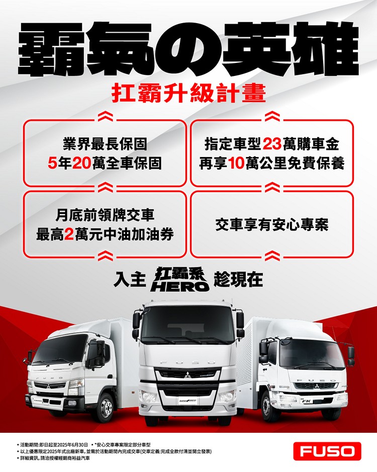 扛霸升級計畫![]() FUSO 推出六月限定購車優惠「扛霸升級計畫」,邀請車主換新車趁現在,包含: 除上述優惠之外再加碼,限定車型提供柴油、尿素加滿的「安心交車專案」及凡於 2025 年 6 月 30 日前完成領牌交車,最高可享 2 萬元中油加油券。