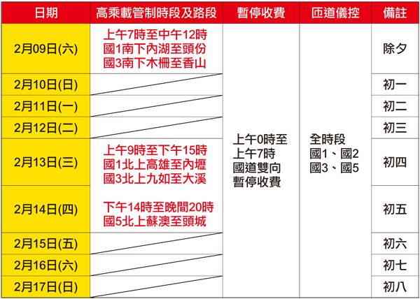 北返的管制時段則在初四及初五也就是2月13及14兩日進行入口管制,國道1號為北上高雄至內壢區間,國道3號為北上九如(屏東)至大溪區間,時間為上午9時至下午15時止。 國道5號雖然在除夕當天沒有進行南下管制,但在開工前後同樣也有北返的高乘載管制,管制時間為13、14兩日下午14時至晚間20時止於北上蘇澳至頭城區間。 高乘載主要目的在於避免過多車輛進入國道所造成的交通阻塞,每年都會有許多不知情的民眾在國道入口處擋下,為防止這樣的窘境發生,民眾於管制時段內務必確認人數達到最低限制才可前往高速公路。