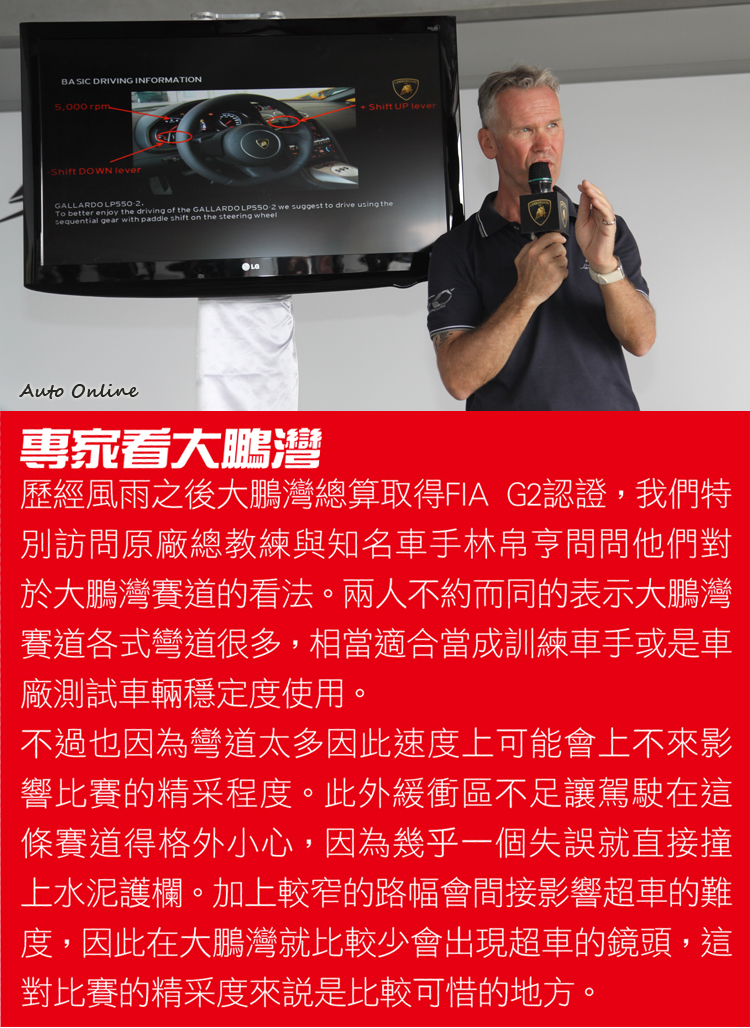 為了深耕台灣市場,在Lamborghini Taipei的努力下如今車主不用飛上海或是馬來西亞參加原廠駕駛體驗營,因為舉凡車輛以及教練通通飛抵台灣,坐高鐵到屏東大鵬灣就可以體驗Lamborghini那特有的牛勁!