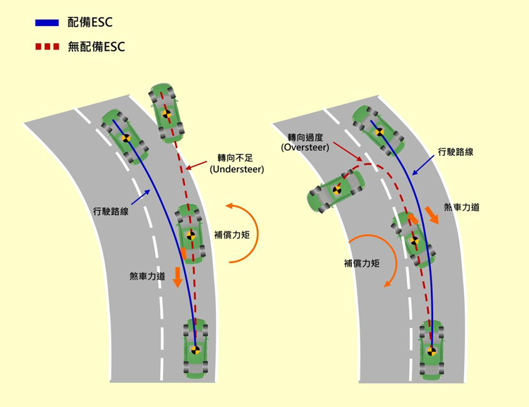 具體來說,當車子想要閃避前方或進入彎道時,因為地面溼滑或激烈的轉動方向盤,就容易出現轉向不足或轉向過度的情況。車子左彎時,當ESC偵測到車輛出現轉向不足,會立即發出指令降低引擎扭力輸出並對後輪施加煞車力讓車輛產生逆時針的補償力矩幫助車輛轉向。相反地,當車輛轉向過度時,系統就會控制引擎扭力輸出並對右前輪施加煞車力,讓車輛產生順時針的補償力矩削弭車輛轉向力道。