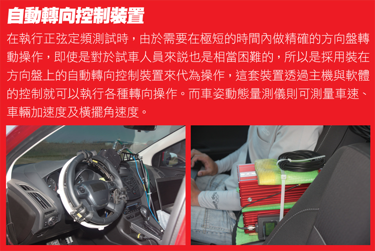 實際測試示範登場!在實際進行ESC系統評價時會包含緩慢增加轉向程序與正弦定頻(Sine With Dwell)測試,其中緩慢增加轉向程序是讓車輛在80km/h定速行駛中逐漸以13.5度/秒的速度提高方向盤轉角,讓車輛以螺旋軌跡行進,每次當側向加速度達0.5g時停止。測試6次線性回歸取得側向加速度0.3g之方向盤轉角A值,這個A值每部車款不同。