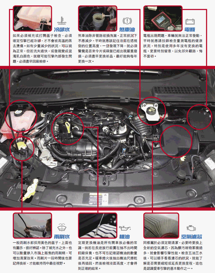 ![]() ▲長途旅行前,先行檢查車況是必須的,而除了關心引擎健康狀況,也要留意胎壓是否適當,並檢視胎紋深度是否有更換新品的必要。對於新手駕駛來說,把愛車交給保養廠處理最直接了當,不過基本的車況檢查其實一點都不難,花點時間學起來,不但可以省下一筆錢,出門在外車輛發生故障,就算不能立即排除障礙,至少也知道問題出在哪裡,避免任人宰割的機會。接下來,我們就以圖解方式,提醒大家基本的五油三水保養與注意事項。 ![]() ▲車輛的健康狀況也會透過儀錶顯示,但開車族必須先認識這些圖示代表的意義,這些在車輛的使用手冊上都會記載。