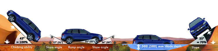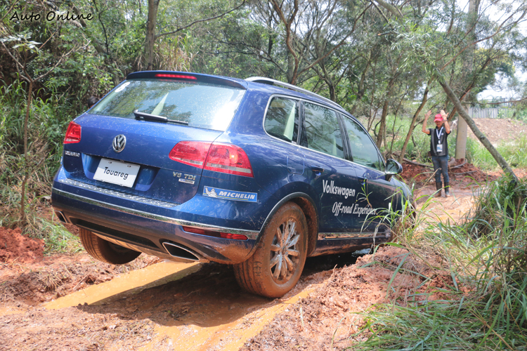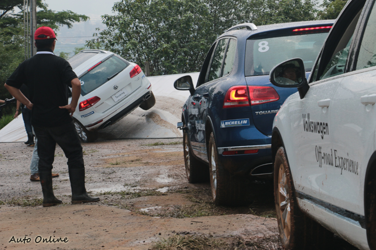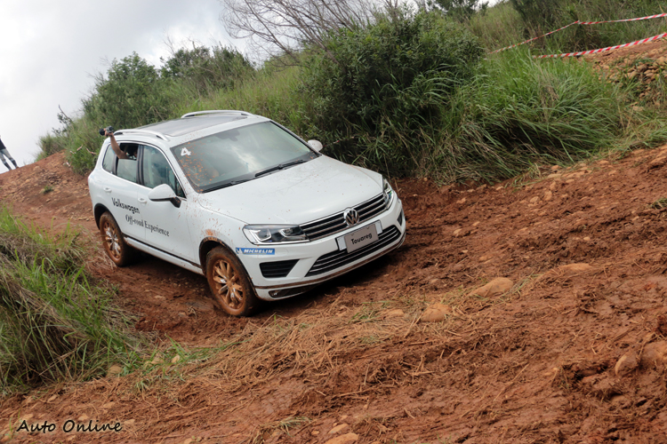 傾斜坡、沙地、叢林坑洞![]() ▲Touareg強大的扭力讓它得以穩定地攀爬山巔。接著是由人工搭建的傾斜坡關卡,車輛首先由側向開上坡面,此時車輪會因為高低落差而讓車身出現明顯傾斜,至於駕駛在座艙內的視線也會受到影響,沒有經驗的駕駛很可能就因為恐懼而進行錯誤的操作,進而陷入危險。通過本關卡的秘訣同樣是抓好方向盤,小心控制油門深度,盡量以最慢速度通過障礙,才能避免車身翻覆。一般進行Off-Road時,絕對要避免落單,像是這種傾斜坡就最好要有人站在車外引導,因為車內的人很容易會誤判傾斜角度而讓車輛翻車。 ![]() ▲4MOTION系統在強大的電子輔助科技支援下,具備一定程度的越野能力。![]() ▲開下陡坡時,斜坡緩降系統協助駕駛自動減速,完全不需要採煞車。![]() ▲老話一句,任何看似簡單的越野動作,都要有人下車指引。![]() ▲爛泥巴加上輪轍,簡直是一場惡夢,不過此時卻可展現車輛優異性能。![]() ▲在叢林坑道中,跨越角大小以及輪軸落差決定了能否脫困。