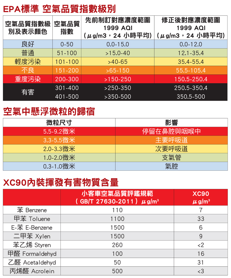 Clean Zone 純淨車室裝置![]() ▲Clean Zone 純淨車室系統是當今市場同類產品中最為高效的一款。VOLVO也成功研發出比以往更為高效的全新標配車室過濾裝置,並以2015年剛引進國內的新一代XC90 作為首款搭載車款。Clean Zone 純淨車室裝置為Drive-E 動力系統的一部分,也是 VOLVO 車室空氣品質的解決方案,它包括植入各項可為駕駛營造更舒適車內環境的科技,諸如涉及進氣、內裝排放、異味以及與內裝表面要求相關的技術,Clean Zone 提供了可提升舒適性與健康的創新型解決方案,而搭載 Clean Zone 純淨車室系統的 XC90 在中央顯示幕左側通風口處擁有Clean Zone的Logo裝飾。 ![]() ▲當系統檢測到有害物質後,就會透過開啟內循環系統切斷所有進氣。![]() ▲IAQS 中的感測裝置能監控進入車室的空氣,並在必要時關閉進氣口。![]() ▲VOLVO恆溫空調系統通過地球上最寒冷與最炎熱氣候下的極端測試。![]() ▲VOLVO嚴選內裝材質,來解決化學物質揮發與新車氣味問題。![]() ▲嚴格控管所有金屬組件中鎳的溶出與減少塑膠組件中的有害添加物都是VOLVO對材質關注的重點。![]() ▲對於具有過敏體質(特別是孩童)的人而言,對於「健康」車室的要求更是高於一般。