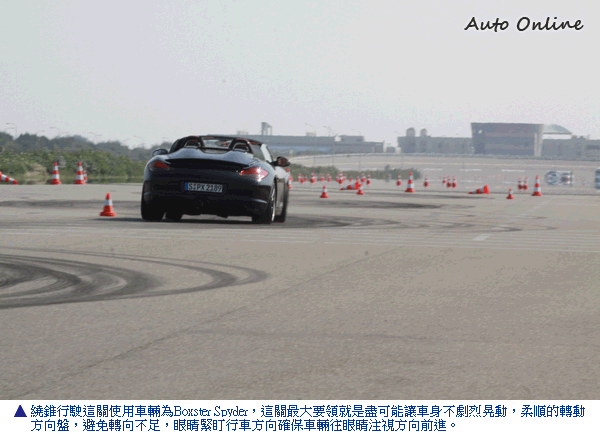 麋鹿測試(Moose Test)![]() ▲當駕駛在濕滑路面閃躲障礙物, PSM系統會透過各個感知器來監控車輛動態狀況,當車輛發生轉向過度或者不足時,會分別控制四個輪子的煞車力道,以恢復車體穩定性。麋鹿是國外鄉間道路上常出現的動物,在鄉野間開車麋鹿突然衝出,駕駛沒有時間踩煞車必需快速做出迴避動作,這關就是要訓練駕駛快速閃躲造成車輛轉向過度的修正,使用車輛為Panamera S Hybrid透過車輛的車身動態穩定系統(PSM)來輔助駕駛修正,PSM系統會透過各個感知器來監控車輛動態狀況,當車輛發生轉向過度或者不足時,會分別控制四個輪子的煞車力道,以恢復車體穩定性。 繞錐行駛(Slalom)