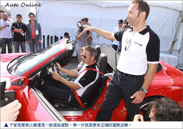 在開始所有訓練的第一步,教練還是從駕駛座姿開始講起,坐進駕駛座雙腳保持微彎,不可以太直或者太彎,在發生危急狀況時才有好的施力點可以全力踩煞車;雙手的手掌下緣可以觸碰到方向盤上緣是方向盤的最佳距離,當一切姿勢調整好時就開始今天的Roadshow。