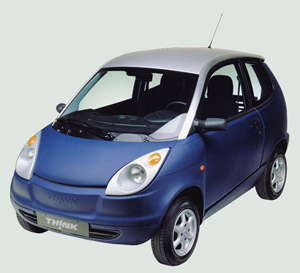 ![]() ▲TH!NK NeighborTH!NK City的車身尺碼為2991×1604×1563mm,車重940kg,其車體部份底盤是由鍍鋅處理過的鋼材製造,而車身則是鋁合金材質的空間樑架(Space Frame)外覆以聚乙烯(一種熱固型塑膠)材質的鈑件及ABS(聚合樹脂)材質的車頂。City所倚靠的是儲存在250kg重的NiCd(鎳鎘)電池中之電力,來推動一個114V的三向交流馬達,輸出叫lash;率27kW(約36hp),採前輪驅動方式推進。根據原廠所公佈的數字,City的極速為90km/h,0-50km/h加速費時7秒,並且擁有電動車中不算差的85km單次充電里程,平常只要以220V的家庭用電充電,大約只需四至六小時就能充飽80%左右的電量。