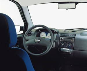 ![]() ▲車長不到三米的TH!NK City麻雀雖小五臟俱全,車室內的設計與一般迷你車無異。不過,在開始介紹一系列TH!NK家族的成員之前,FORD首先展示出來的仍然是他們最新開發,油耗數字為驚人的80mpg(約34km/L)之混合動力概念車Prodigy,這輛車身尺碼接近一般家用小型車的概念四門房車使用了以柴油為燃料的油電混合動力系統,FORD希望能在未來有機會推出大量這種尺碼較為實用、比較有商業前景的環保車輛。不過,整個TH!NK家族的核心車款,則是稍後才登場的TH!NK City,這輛去年曾經在此地以概念車身份亮相過的雙人座小車,目前已經在挪威以及部份的歐洲國家上市,並且預計在2000年底前開始登陸北美。